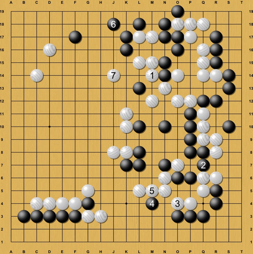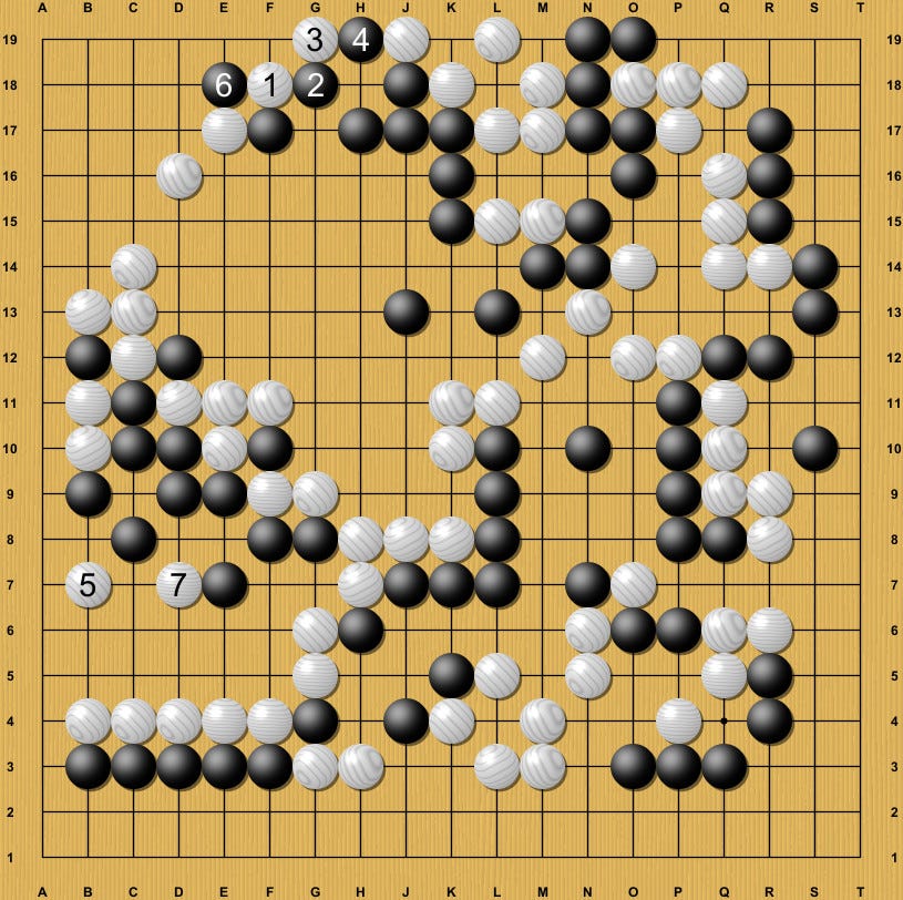 白1、3が上辺を助け出す手段を見たコウの勝負手。黒6とコウを解消したため、白7で左辺の黒が頓死してしまい、白勝ちが確定しました。