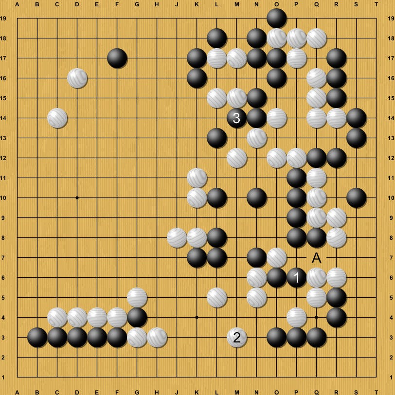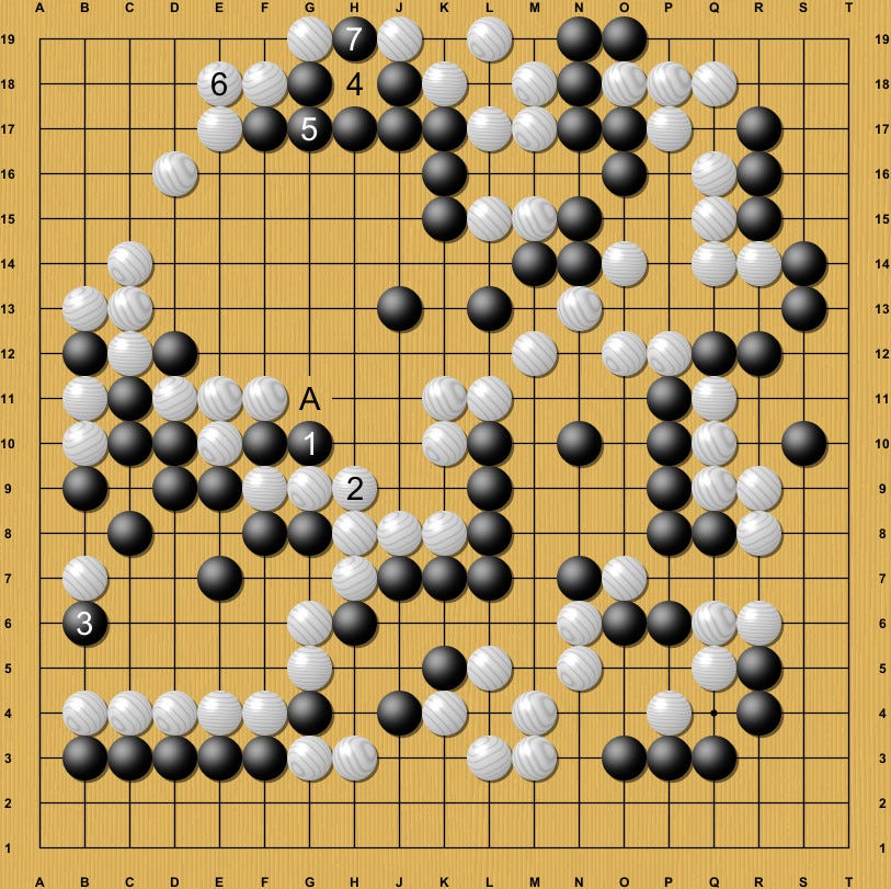 黒1、3と左辺の生きを確かめる一手でした。白4以下でコウ争いが続くも、黒Aのコウ材があり、黒も互角以上に戦える碁形になります。