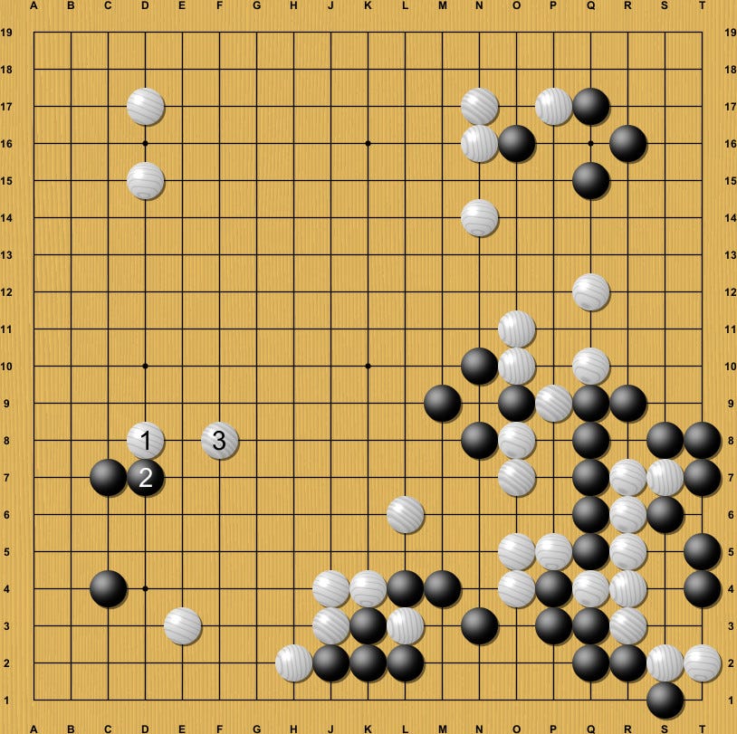 白2と根拠を奪うのは、黒3で簡単には捕まらない格好。後に、黒A以下の狙いも厳しくなるため、本図で勝負するのは白にとって怖い進行です。